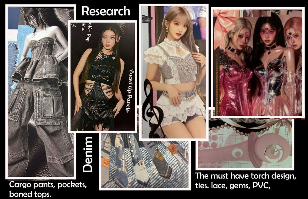 Jane will visit the students again in 4 weeks to look at their research. The students research showed how K-POP culture had influenced all areas of fashion, even M&S had women’s ranges in store with cargo pants and excessive use of lace and frills on shirts. Research showed use of PVC, LACE and TIES and add on accessories of chains, fringing, diamanté. The basic under garments were cropped tops, shorts, skirts and trousers. Every brand of clothing had matching torches and microphones to complete to look. Images show the trends that will influence the final design.